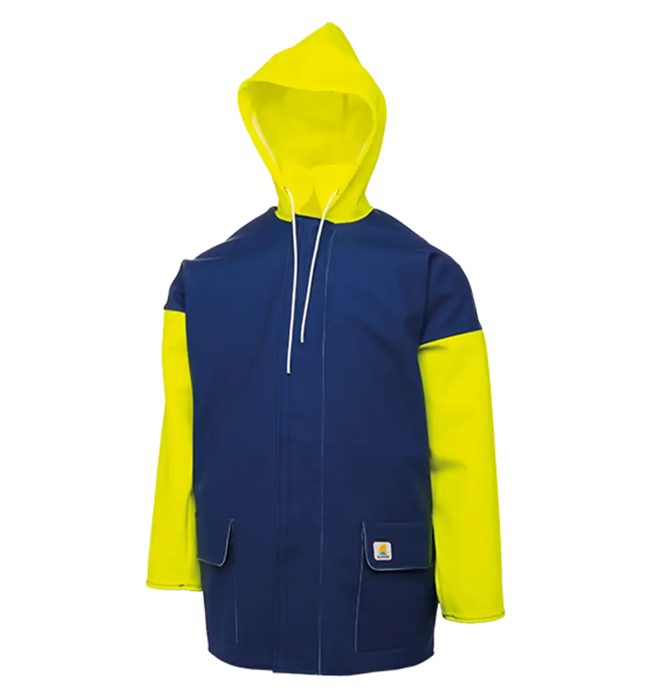 Fabricada en tejido MIX, compuesto por poliéster flexible extra resistente al desgaste, recubierto de PVC por una cara. Ofrece alta resistencia a grasas y aceites, gran durabilidad en entornos profesionales exigentes y excelente comportamiento a bajas temperaturas. Diseño de alta visibilidad en combinación azul y amarillo flúor. Fabricación en España.